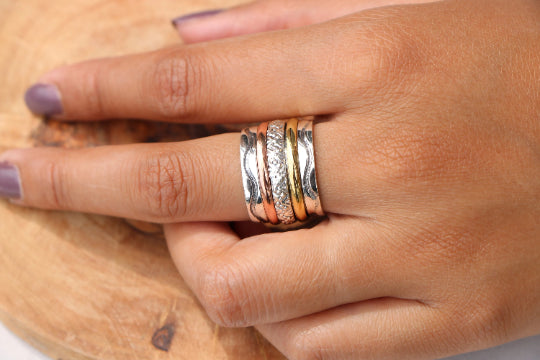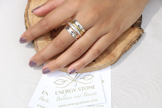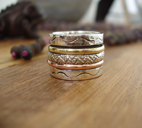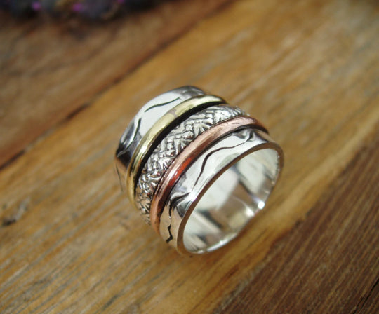 Energy Stone “RADIANCE” Meditation Spinning Ring Wave Sterling Silver Patterned Shank with 1 Brass 1 Copper Spinners