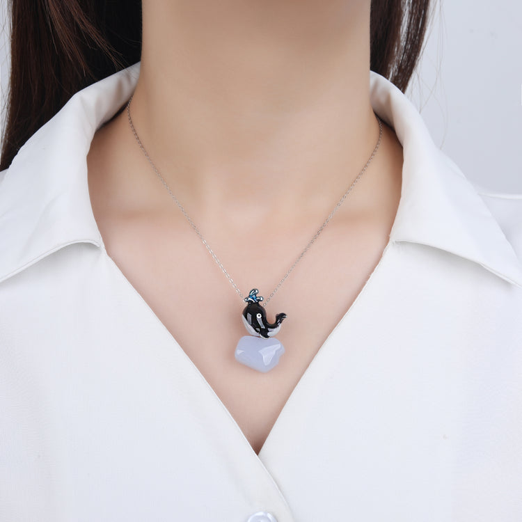 Embrace your own unique frequency with Energy Stone’s Whale Pendant and find your authentic voice. Known as some of the most solitary creatures in the world, whales represent the freedom to be oneself. Whales are skilled communicators, using their unique songs to convey their needs to others of their species, just as we must find our own unique ways to communicate to those around us. Their huge bodies are awe-inspiring; how can something so large move so gracefully? Whales live in water, but like humans, breathe air, thus embodying both elements of water and air, representing the nature of duality. Made from sterling silver and painted with enamel for a super smooth finish, this pendant measures 19x32mm with a hidden bail in the back. The truful whale sits atop a piece of high quality translucent blue chalcedony which resembles ice. Pendant sold independent of chain.