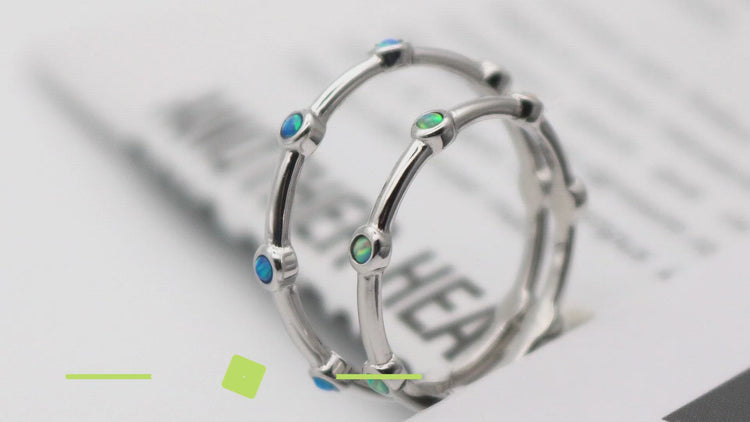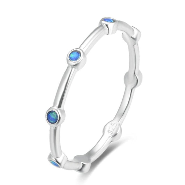 Introducing the 'FERRIS WHEEL" Japanese Opalite stacking ring by Energy Stone! Eight pieces of high-quality Japanese Opalite are bezels set into the high polish sterling silver narrow band. Our Ferris Wheel ring is like an eternity band - there is no beginning and no end. It sits comfortably in your finger and there is no worry of it turning around. Japanese Opalite is high-quality Opalite which shimmers mystical opalescence fire. The sky blue color pops the ring without being overbearing. Wear this ring alone or in combination with other thin stacking rings. Create your own statement jewelry set -- the combinations are endless.
