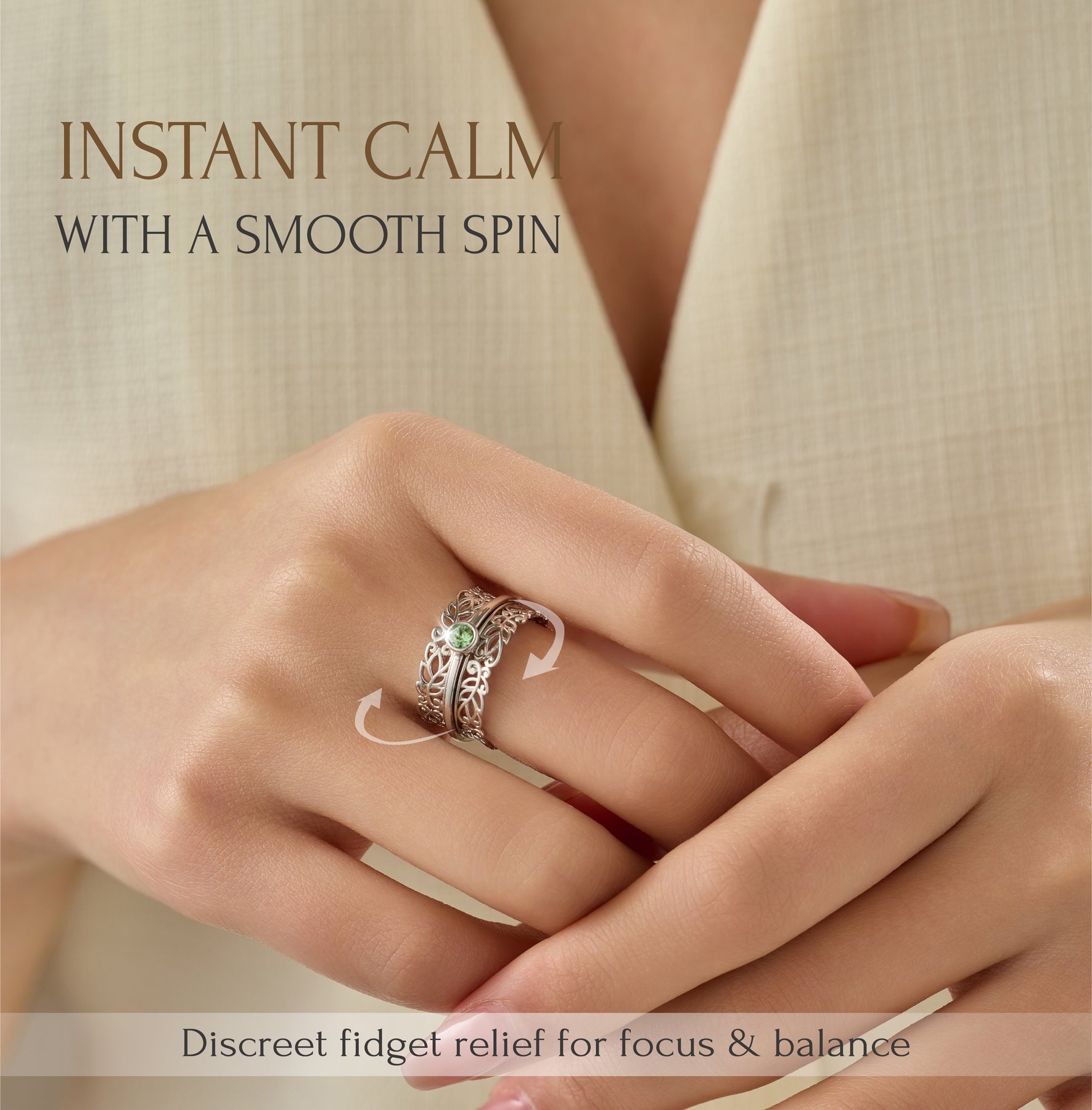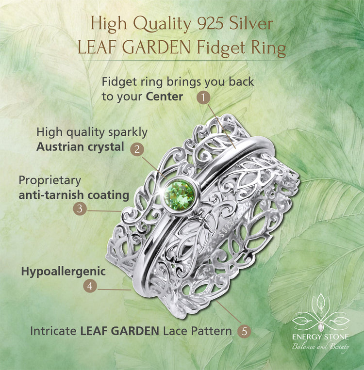 Intricate LEAF GARDEN lace pattern 925 sterling silver fidget spinner ring with high quality sparkly Austrian crystal, spins smoothly on its track. Helps you center and restore focus throughout the day!