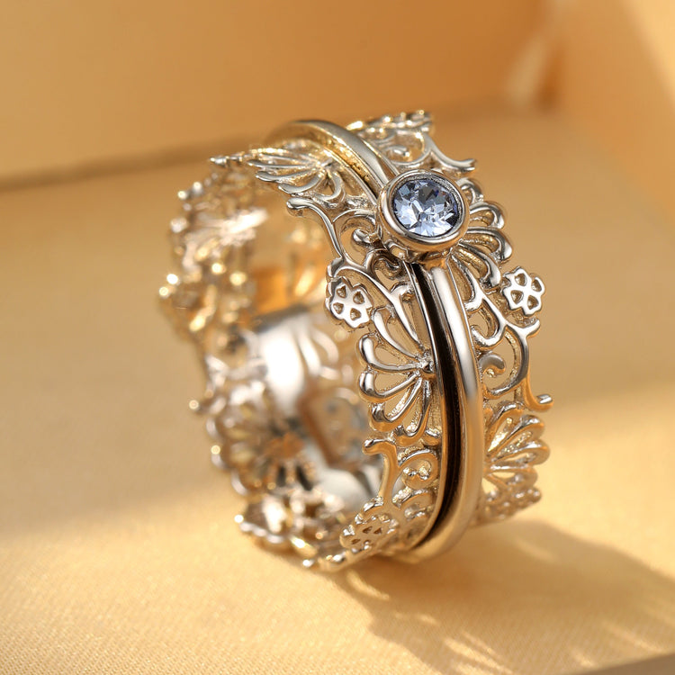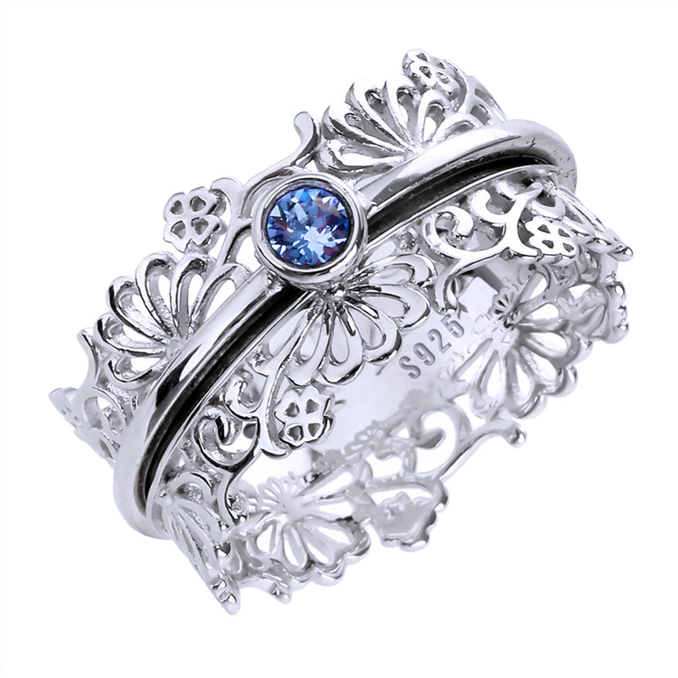 WILDFLOWERS 925 Silver Fidget Ring Beautiful Silver Lacework Light Sapphire Austrian Crystal