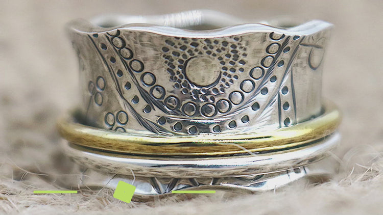 Sun salutation. Acknowledge the bestower of life and salute the sun. The SUN WORSHIP meditation spinner ring is engraved with an Indian sun and floral motif and features double spinners. Reconnect with and honour the power of nature.